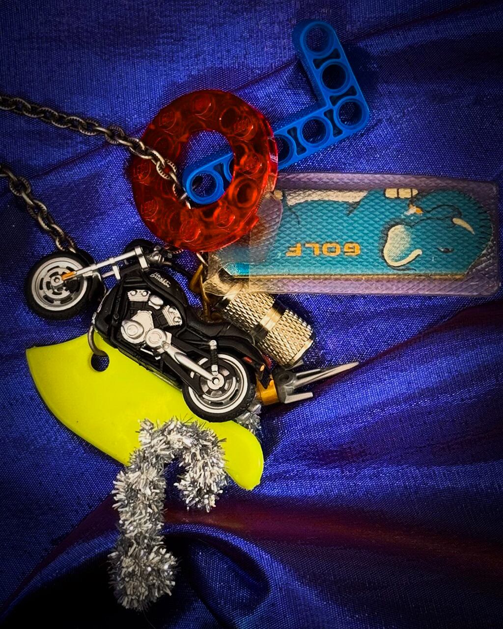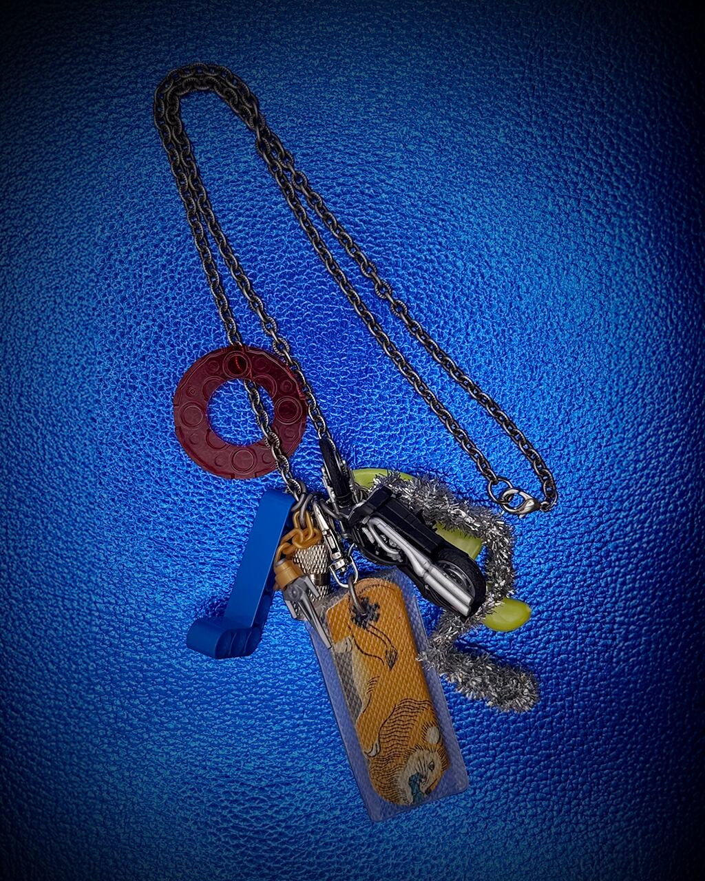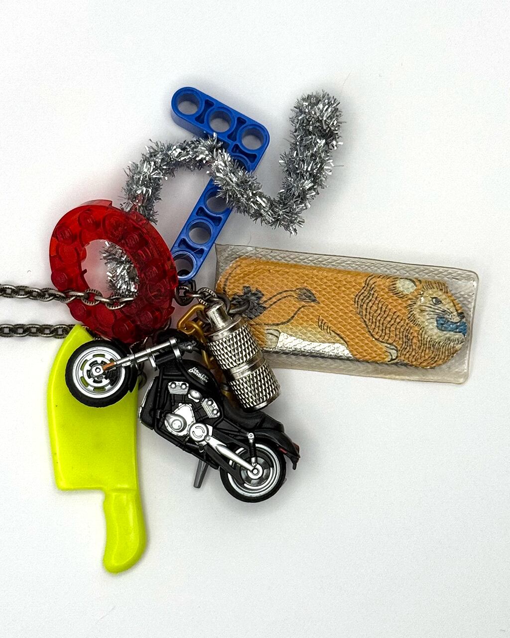 ヴィンテージの虎と象のペーパーナイフをメインに、バイクやイエローのおもちゃナイフ、輪のブロックなどをミックスした遊び心たっぷりのネックレス。
