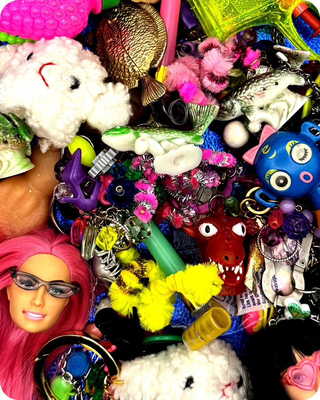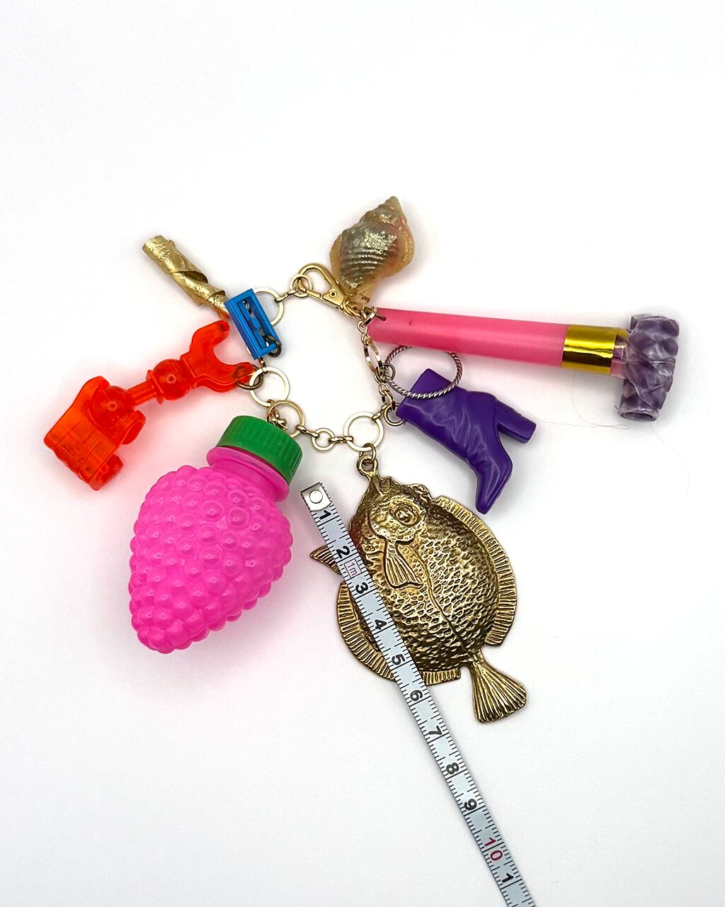 ヴィンテージパーツの魚や貝、ドールブーツやミニ吹き戻し、ブロックパーツなどがミックスしたチャーム。バッグにつけるとゴロゴロっと存在感だします。