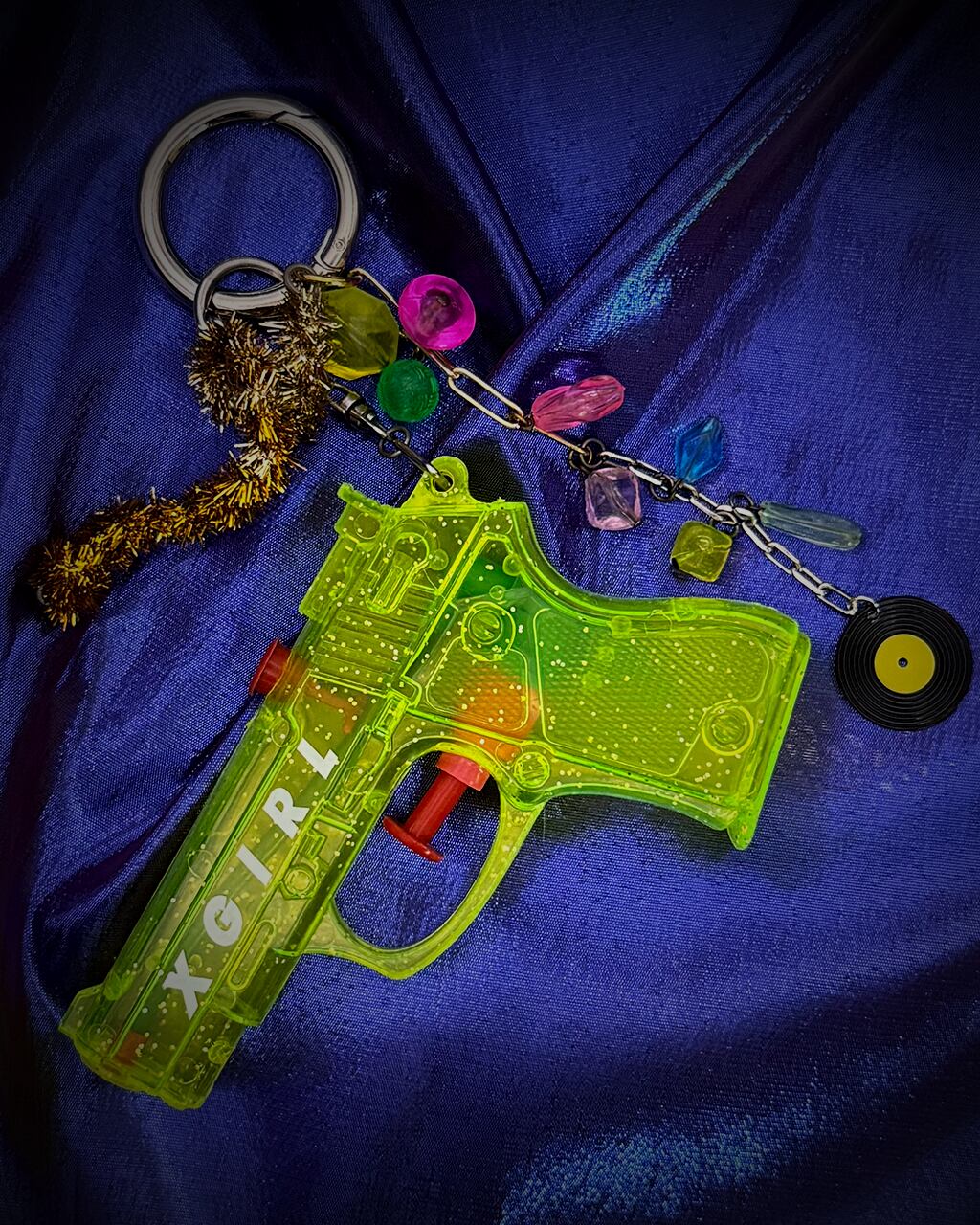 蛍光イエローの水鉄砲。手作りパーツやヴィンテージパーツをあしらった、フェスに連れて行きたくなるチャーム。