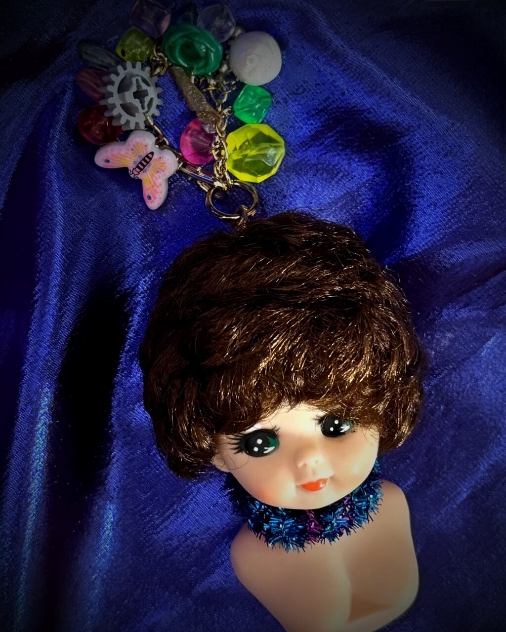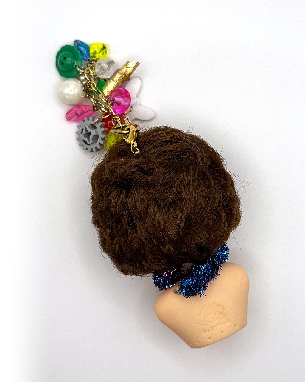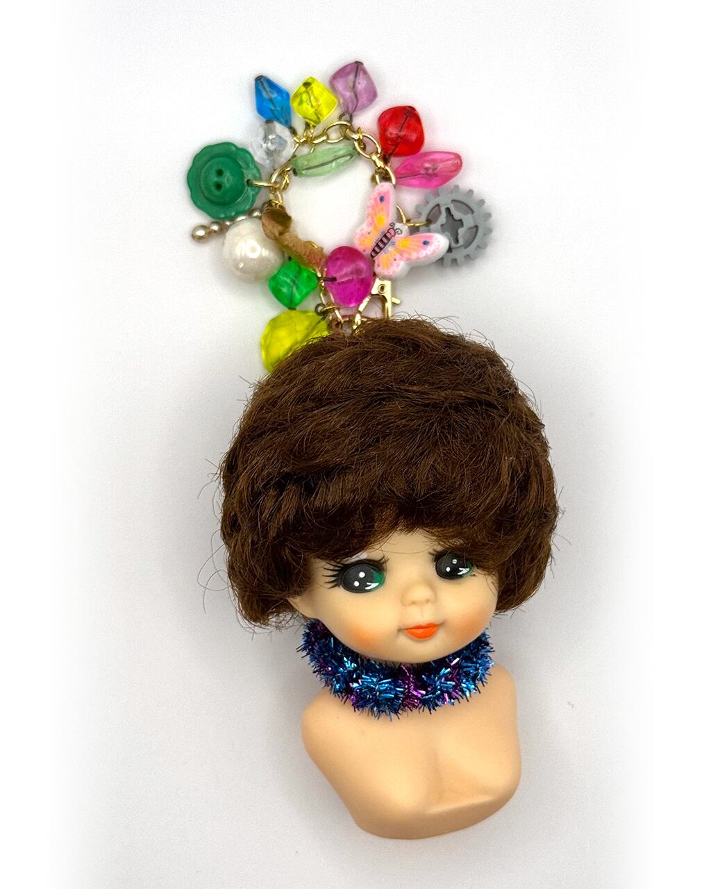 絶妙なヘアースタイルがたまらないレトロ人形に、ヴィンテージパーツやブロックがたくさんついたボリュームのあるチャーム。