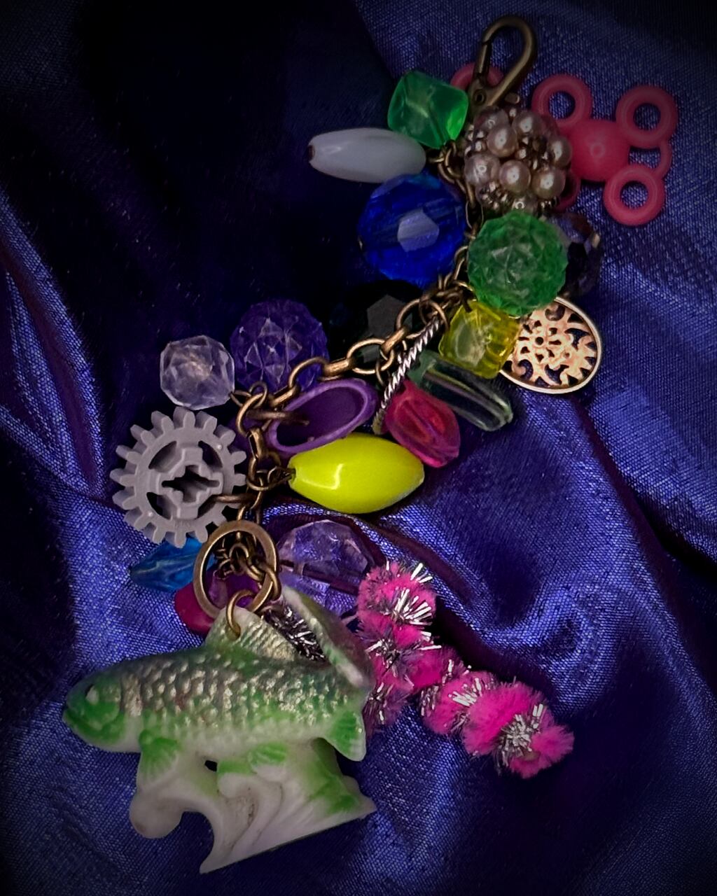 メタリックな魚とカラフルなレトロパーツをごろっとつけたボリュームありありチャーム。じゃらじゃらと存在感をアピります。