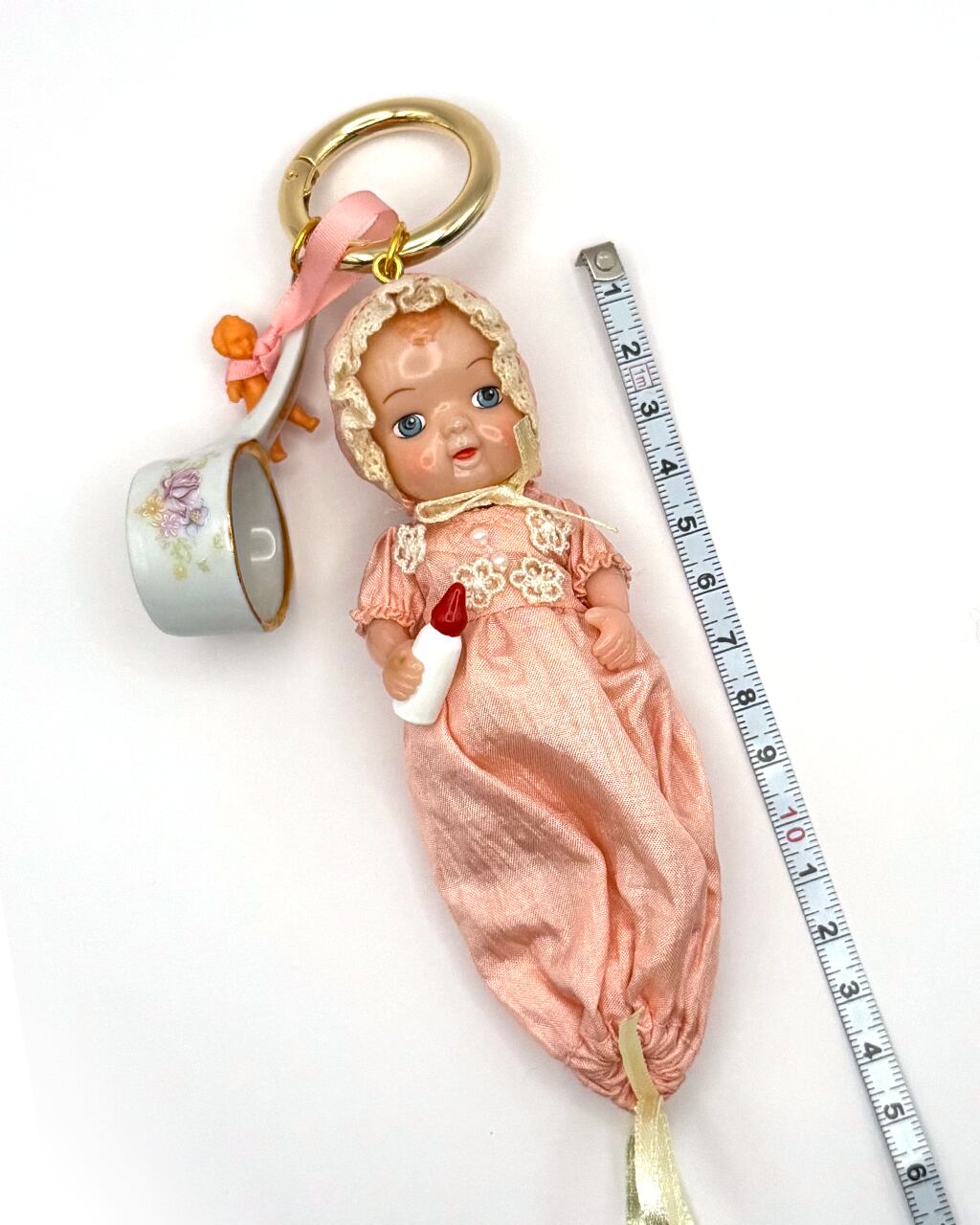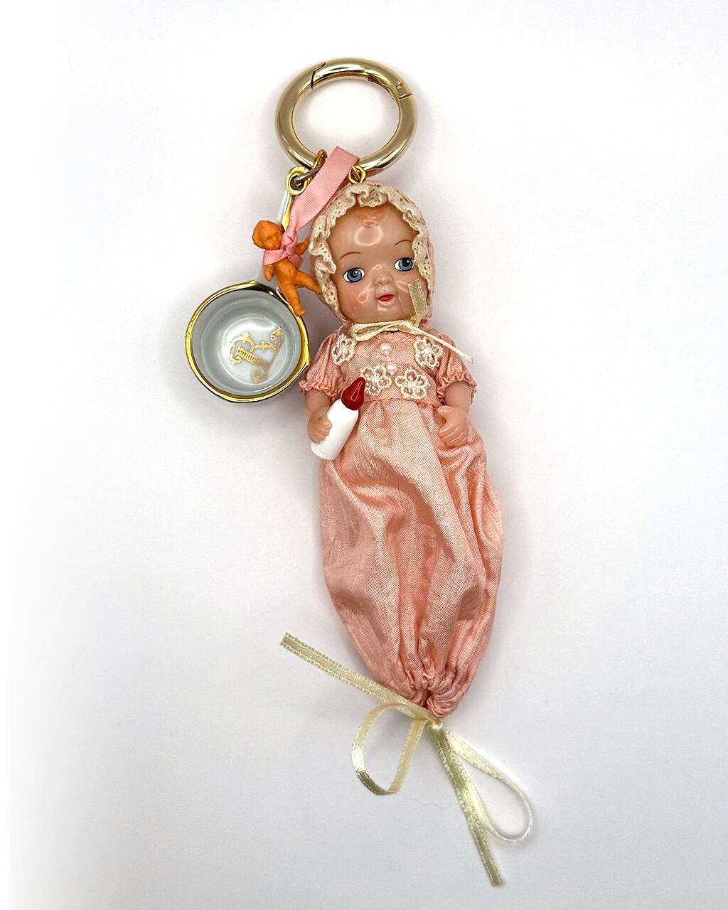 デカベイビーとチビベイビー、さらにヴィンテージフレンチのミルクパンのチャーム。袋状になっているデカベイビーの下はリボン結び。
